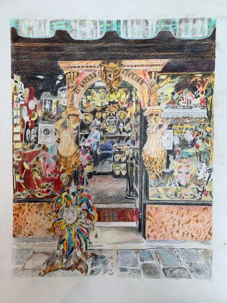 Carnival mask shop, Venice, coloured pencil, 50 x 38cm